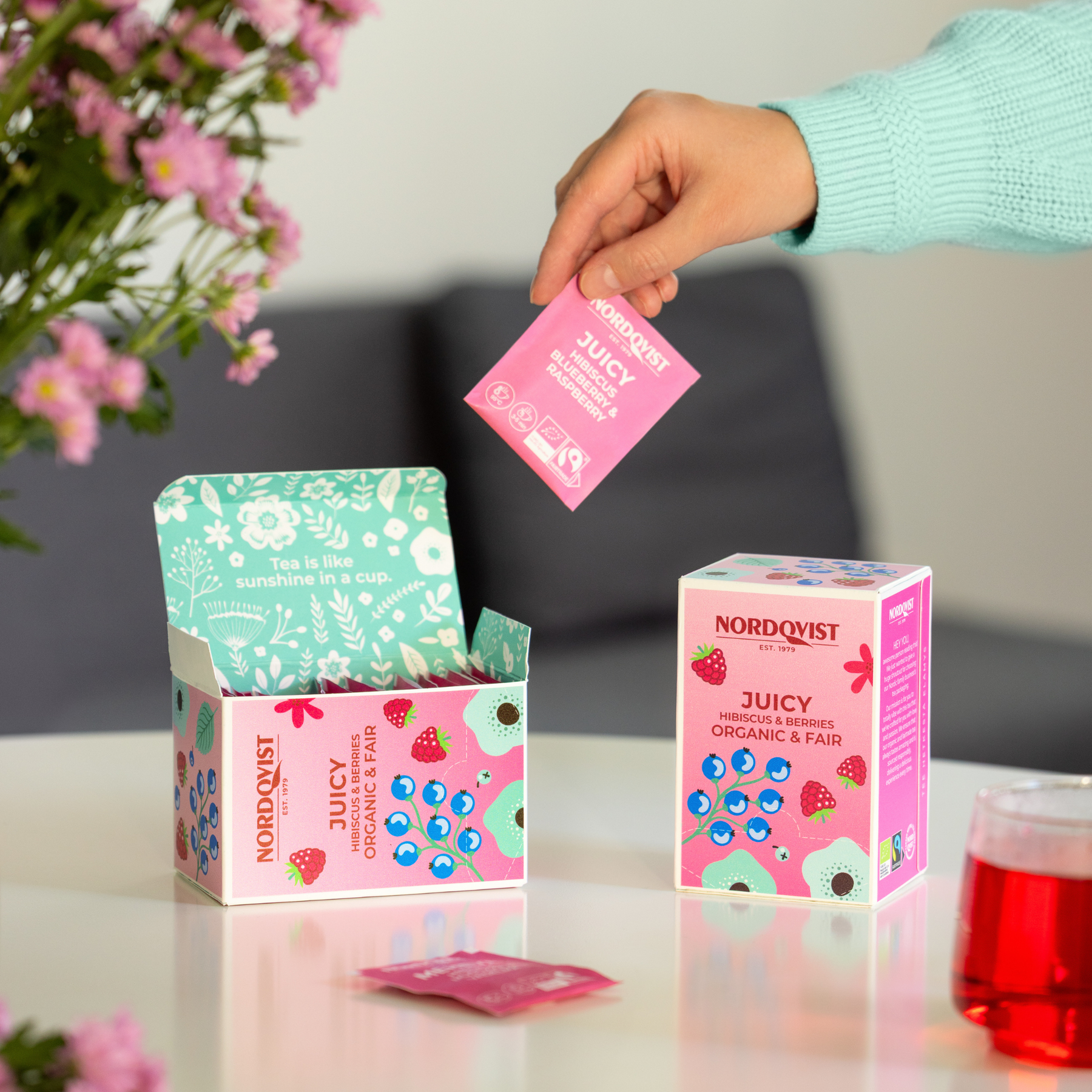 Juicy bag tea is a juicy blend of hibiscus, apple, and forest berries. You can enjoy rich tea moments around the clock, as the product is naturally caffeine-free. It is made from organic and Fairtrade ingredients at Nordqvist factory in Nurmijärvi.